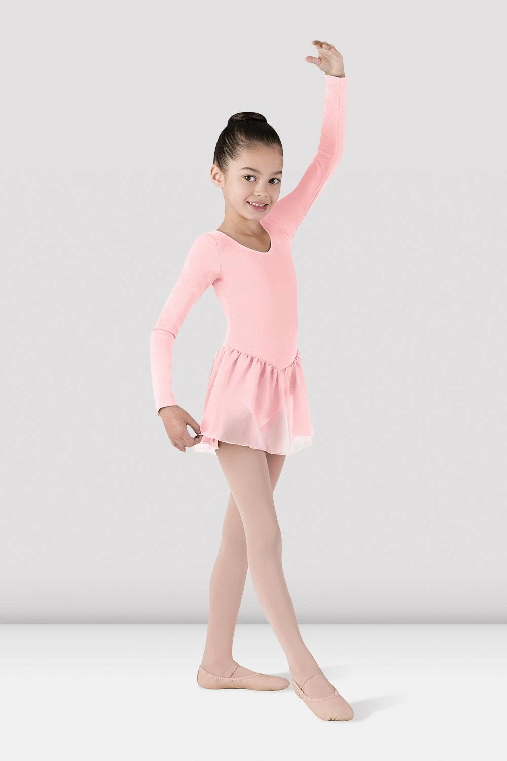 Every young dancer needs this long sleeved skirted leotard in their dance wardrobe! Features a scoop front and back and a full front lining, as well as long sleeves for extra coverage. Soft cotton bodice with delicate attached Georgette skirt.