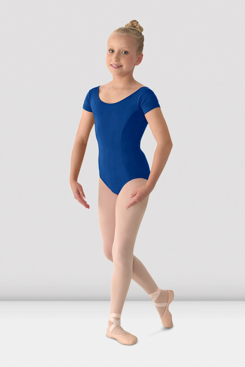A stylish cap sleeve leotard for children that features a modest scoop neckline and front princess seams.