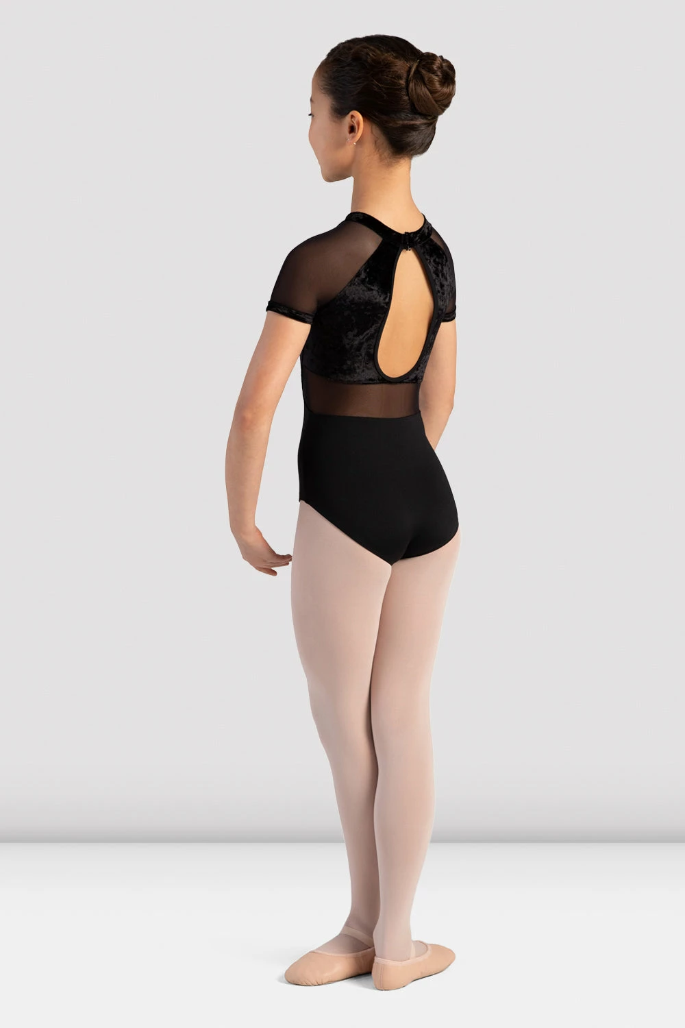 Our Girls Sasha Mock Neck Leotard features a velvet bodice with mesh cap sleeves and an open teardrop back. Part of our Holiday Velvet Collection featuring beautifully crushed velvet detail in a palette of sweet and stylish colors.